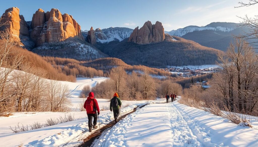 Der Winter verwandelt Pfade und Felsen in stille Bühnen — perfekt für kurze Entdeckungen. Pack warme Schichten, plane Puffer und starte früh.